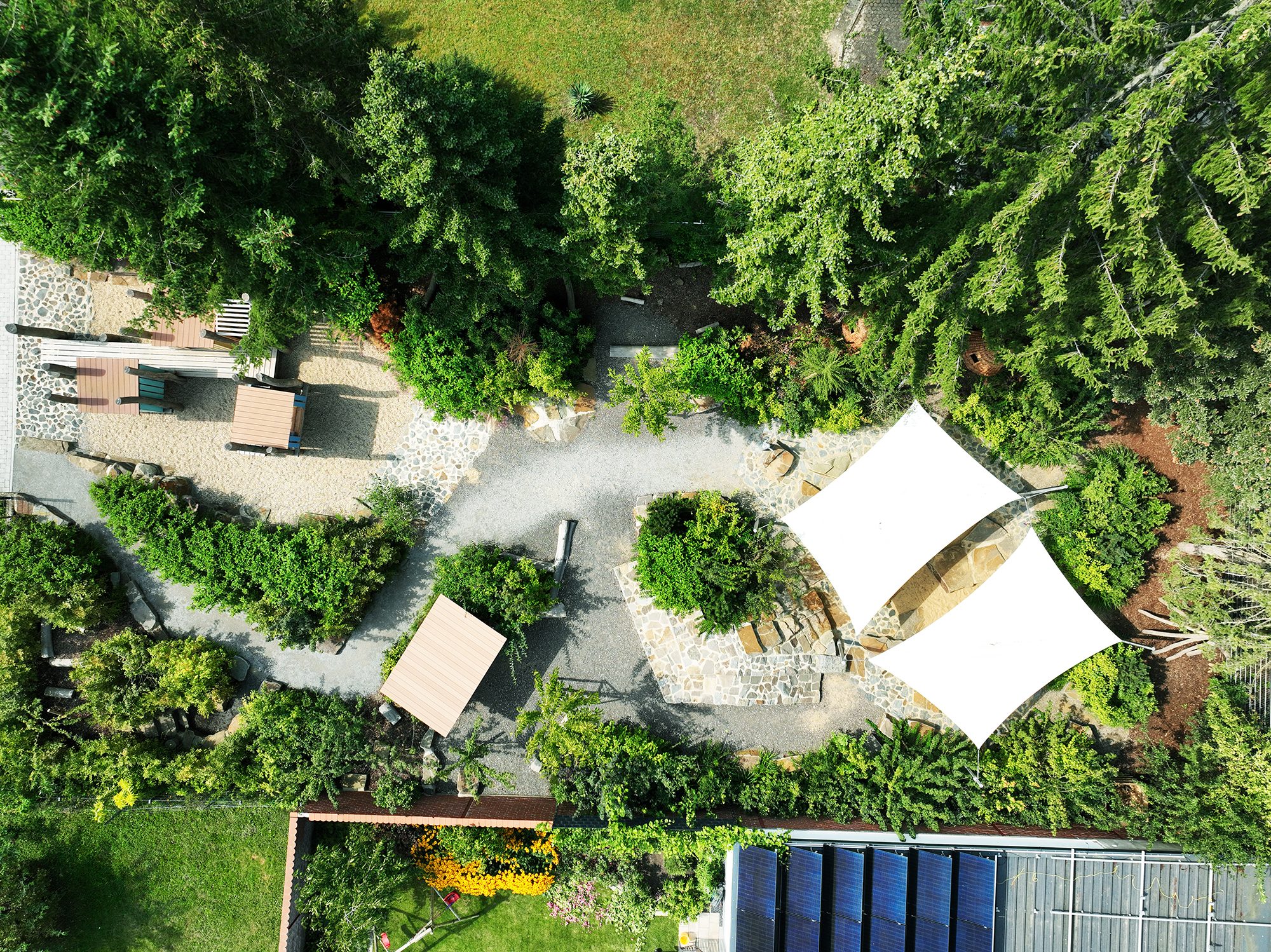 Gestalterisch haben sich Stephan und Annette Heine von nordischen Landschaften inspirieren lassen. So entstand ein „kleines Alaska“ mit Felsenhängen, Canyons, Indianertipis, Abenteuerpfaden, Trapperhütten und einem Fischerdorf am See. Modellierte Hügel, Robinienstämme, Wasserstellen zum Matschen und robuste Pflanzungen machen den Garten zu einem abwechslungsreichen Erlebnisraum, der unzählige Spiel- und Entdeckungsmöglichkeiten bietet.