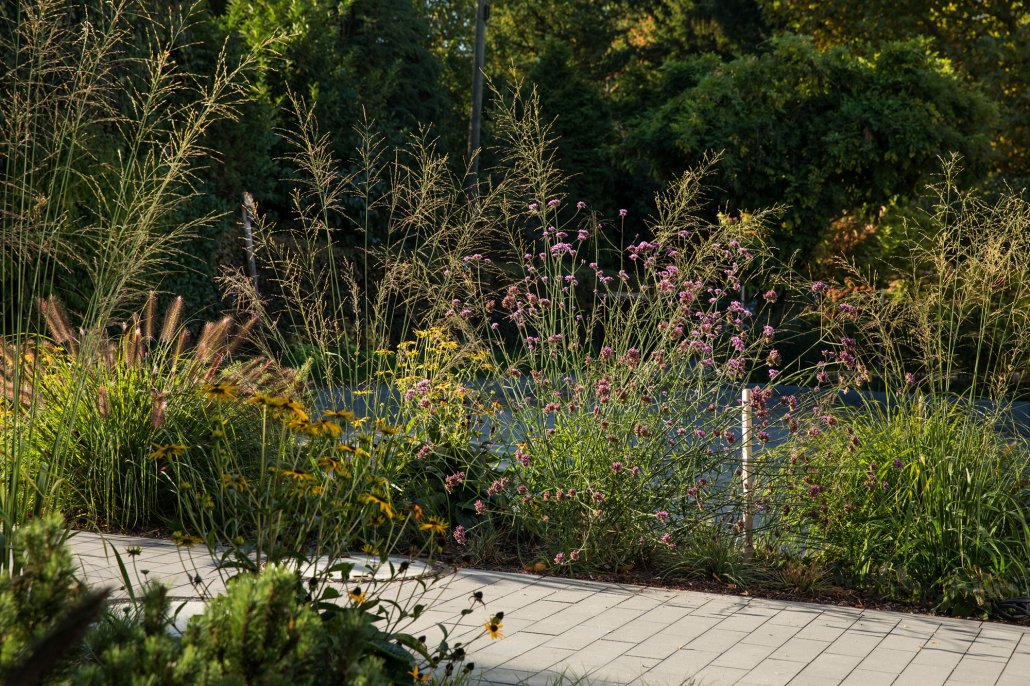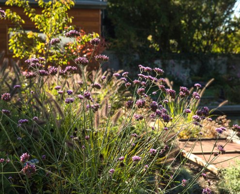 Bei der Pflanzplanung haben wir bewusst auf die Pflanzen gesetzt, die der geradlinigen Form des Hauses entgegenwirken und eine gewisse Leichtigkeit mit sich bringen. Insbesondere Komposition aus Sonnenhut, Prachtkerzen, Verbena, Polygonum und Astern haben wir zu diesem Zweck verwendet. Besonders Gräser sind dank einer eindrucksvollen Farbpalette keinesfalls langweilig und eintönig. Wenn sie blühen, zeigen sich je nach Grassorte Sterne, Bürsten, zitternde Rispen oder haarige Wedel.